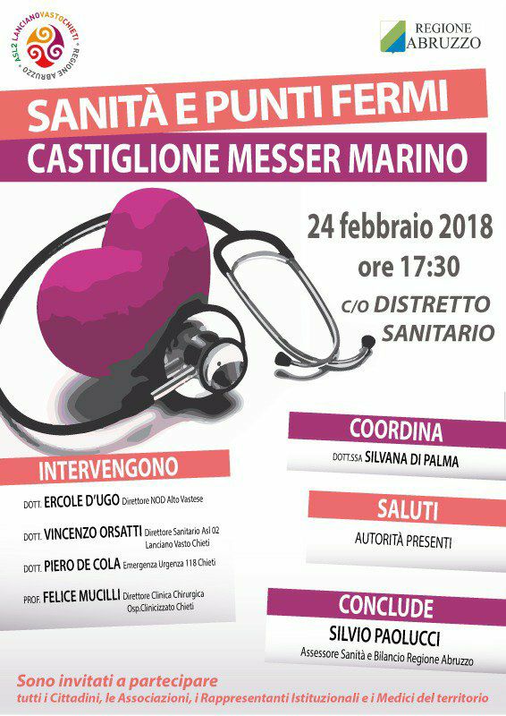 Sanità e punti fermi è il convegno organizzato a Castiglione Messer Marino CH, il 24 Febbraio alle ore 17.30 presso il Distretto Sanitario.