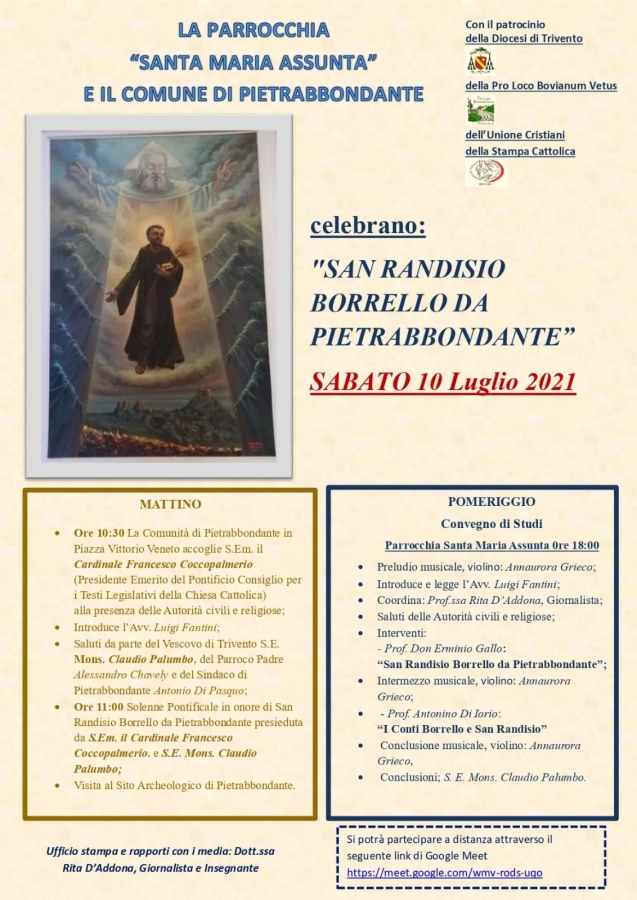 •             Ore 11,00 Solenne Pontificale in onore di San Randisio Borrello da Pietrabbondante presieduta da S.E. il Cardinale Coccopalmerio e S.E.za Mons. Claudio Palumbo;