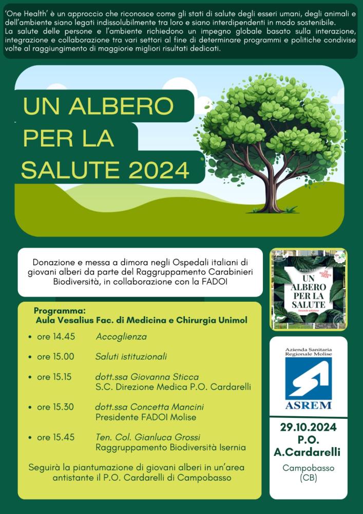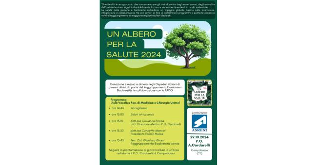 Il progetto ‘Un albero per la salute’ torna in Molise. Dopo l’esperienza al Veneziale di Isernia, questa volta, la piantumazione di giovani alberi avverrà nell’area antistante il P.O. Cardarelli di Campobasso. Un evento promosso da FADOI (Federazione delle Associazioni dei Dirigenti Ospedalieri Internisti), in collaborazione con l’Arma dei Carabinieri - Comando per la Tutela della Biodiversità, supportata dalle Aziende Sanitarie del Paese.