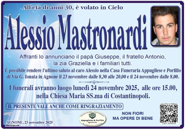 La scomparsa di Alessio Mastronardi, 30 anni, ha lasciato un dolore profondo e una costernazione sincera in tutta la comunità agnonese. Alessio era un ragazzo splendido: ha saputo essere per tutti un esempio luminoso di gentilezza, forza e dignità.