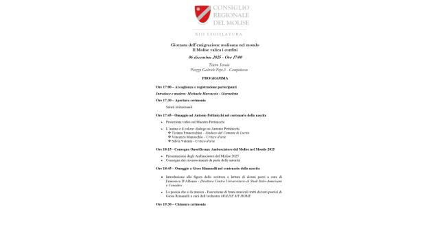 Campobasso, 28 novembre 2025- Il Consiglio regionale del Molise promuove la “Giornata dell’emigrazione molisana nel mondo”, un appuntamento annuale dedicato alla riflessione, alla memoria e alla valorizzazione del legame tra il Molise e le comunità molisane residenti all’estero.