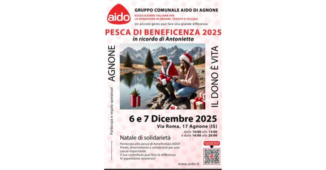 Agnone si prepara a vivere un fine settimana all’insegna della solidarietà con la tradizionale Pesca di Beneficenza AIDO, in programma sabato 6 e domenica 7 dicembre 2025 in Via Roma, 17, con apertura sia al mattino (10:00–13:00) sia al pomeriggio (16:00–20:00).