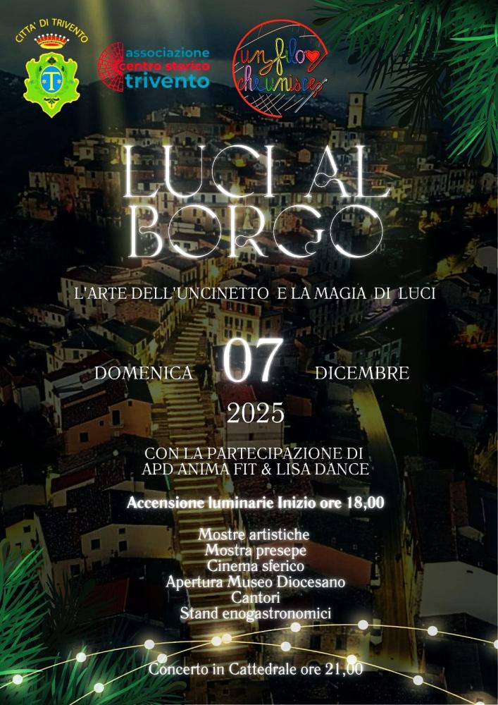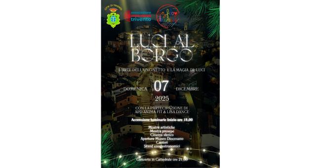 Nel centro storico di Trivento, domenica 7 dicembre si terrà l'atteso evento "luci nel borgo". La luce e l'abete: due simboli di rinascita, in pieno spirito natalizio, che i visitatori troveranno insieme lungo la monumentale scalinata di San Nicola. Gli alberi addobbati di luci accompagneranno i visitatori in un percorso che li porterà nel cuore del centro storico.
