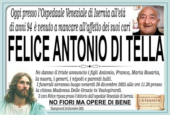 Si è spento ieri 24 dicembre presso l’Ospedale Veneziale di Isernia, all’età di 94 anni, Felice Antonio Di Tella, classe 1931, figura storica e amatissima di Vastogirardi. Circondato dall’affetto dei suoi cari, lascia un grande vuoto non solo nella sua famiglia, ma in tutta la comunità.