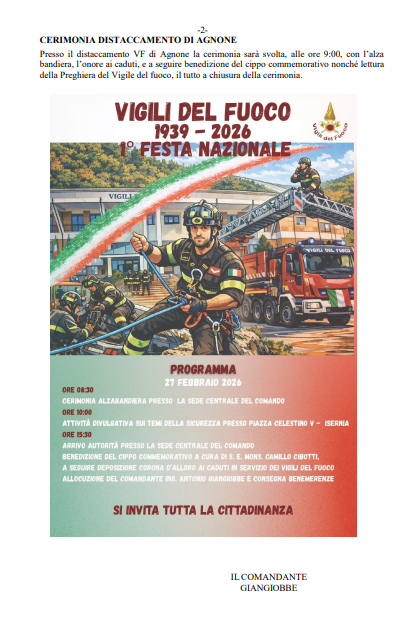 -2- CERIMONIA DISTACCAMENTO DI AGNONE Presso il distaccamento VF di Agnone la cerimonia sarà svolta, alle ore 9:00, con l’alza bandiera, l’onore ai caduti, e a seguire benedizione del cippo commemorativo nonché lettura della Preghiera del Vigile del fuoco, il tutto a chiusura della cerimonia.