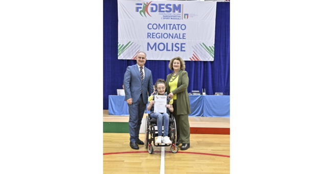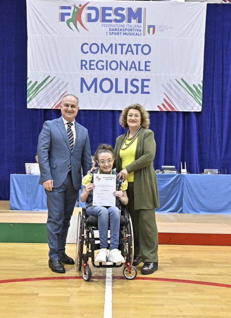 Dopo una mattinata dedicata alla Coppa Molise, i riflettori si sono accesi sulla Danza Sportiva, regalando momenti di altissimo valore tecnico ed emotivo. A brillare sul parquet sono state in particolare due atlete della danza paralimpica, entrambe espressione dell'eccellenza della scuola AG Master Dance e seguite con dedizione dal maestro e tecnico federale Antonio D'Ottavio: -Chiara Paradiso, protagonista nello Show Dance (classe unica), categoria DIR (Disabilità Intellettiva Relazionale). -Federica Ramacciati, ha incantato il pubblico con la Danza in Carrozzina (classe unica), categoria UVS (Unità Visiva o simile). Entrambe le atlete hanno conquistato lo scalino più alto del podio